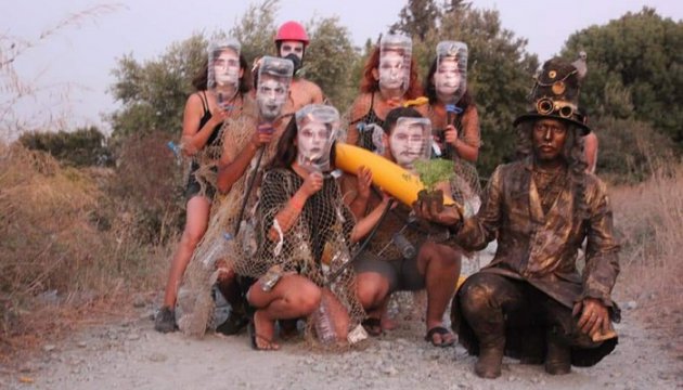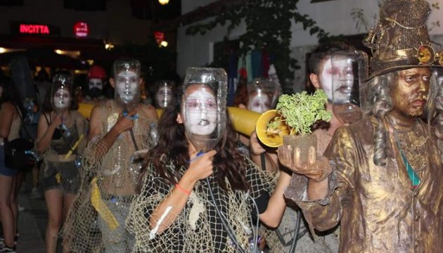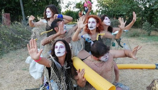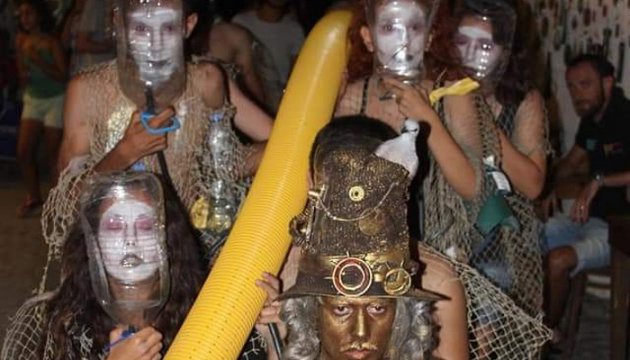 Atık vaziyette bulduğumuz balık ağlarını ve plastik atıkları kostüm olarak kullandık.